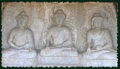 “三世佛”是13世紀(jì)以來藏傳密教(俗稱喇嘛教)佛堂中所供奉的主要佛像。清源山碧霄巖“三世佛”為摩崖石刻,作長方形大龕,高3米、寬6.5米?!叭婪稹辈⑴沤Y(jié)跏坐在仰覆蓮花座上,中尊為現(xiàn)在佛,作觸地印之降魔相;左尊為過去佛,亦作觸地印之降魔相,但左掌上托缽;右尊為未來佛,作施定印之禪定相,皆為上蕃式樣。