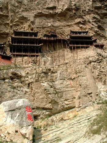 遠望懸空寺,像一付玲瓏剔透的浮雕,鑲嵌在萬仞峭壁間,近看懸空寺,大有凌空欲飛之勢。登臨懸空寺,攀懸梯,跨飛棧,穿石窟,鉆天窗,走屋脊,步曲廊,幾經(jīng)周折,忽上忽下,左右回旋,仰視一線青天,俯首而視,峽水長流,叮咚成曲,如置身于九天宮闕,猶如騰云皈夢。