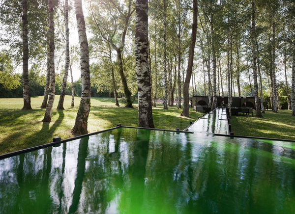 3、融于自然:園林建筑小品要求將人工與自然渾成一體,追求自然又精于人?!半m有人作,宛如天開”則是設(shè)計者們的匠心之處。如在老榕樹下,塑以樹根造型的園凳,似在一片林木中自然形成的斷根樹樁,可達到以假亂真的程度。又如某屋頂花園中建筑結(jié)構(gòu)柱處理成樹干的形式,使其與周圍環(huán)境相融合。