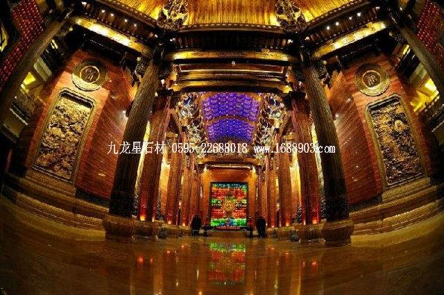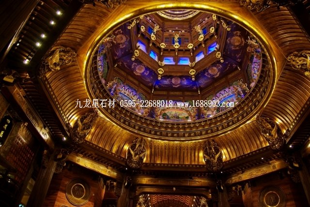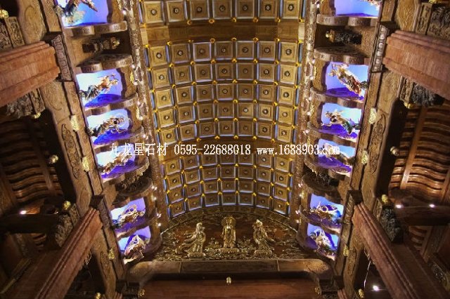 梵宮的內(nèi)部,舉目可見東陽木雕、敦煌壁畫、揚(yáng)州漆器、景泰藍(lán)、琉璃、溫州甌塑等等藝術(shù)珍品。能將如此眾多的中國非物質(zhì)文化遺產(chǎn)納入一座建筑的,目前似乎只有梵宮,也因此,有人稱它為“東方的盧浮宮”。由于梵宮顛覆了中式宗教建筑的傳統(tǒng)理念,舍棄了中國傳統(tǒng)佛教建筑慣用的木頭、琉璃瓦等材料,而用鋼筋混凝土建造,因而為設(shè)計施工帶來了很大難度。