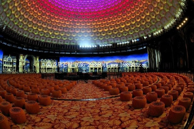 梵宮中最重要的地方莫過于圣壇,這是一個集會議、演出、參觀于一體的圓形場館,也是世界佛教論壇的主會場。建筑面積達(dá)35000平方米,可以舉行2000人的大型國際會議。圣壇上方是高度達(dá)30多米的巨大穹頂,1500盞金光燦燦的蓮花燈瞬間開啟,剎那間千余盞由電腦控制的LED光源拱聚穹頂,仿佛星光燦爛的天穹,可以變幻出1100多種燈光變化。三維立體的舞臺,可以在1分半鐘內(nèi),在舞臺中央“長出”一棵10米高、12米寬、11萬余片樹葉的參天菩提大樹。同時,在幾十臺大型投影設(shè)備和目前世界最為先進(jìn)的數(shù)字燈光控制系統(tǒng)綜合作用下,營造出一種既似如夢如幻、又似身臨其境的美妙景象。由林兆華、何訓(xùn)田等組成的國內(nèi)頂尖團(tuán)隊導(dǎo)演排練的,以弘揚(yáng)傳統(tǒng)文化、啟迪心靈智慧為主旨的大型情境演出《覺悟之路》就在此上演。