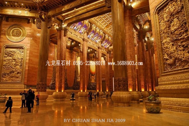 這些木雕均出自浙江東陽一班木雕藝人之手。浙江東陽是中國木雕之鄉(xiāng),北京故宮及蘇、杭、皖等地都有精美的東陽木雕留世。據(jù)統(tǒng)計,整座靈山梵宮的木雕裝飾面積達(dá)1.5萬平方米,用掉2400多立方米的原木。比如一座塔廳高就有65米,跨度為46.6米,面積為2000多平方米,這樣的空間規(guī)模在東陽木雕裝修工程中,從無先例,這比在故宮施工還要難!為此東陽幾乎傾全縣之力,42個廠家,1560多名工匠,從2007年底接手,連續(xù)制作1年零4個月才最終順利完工。