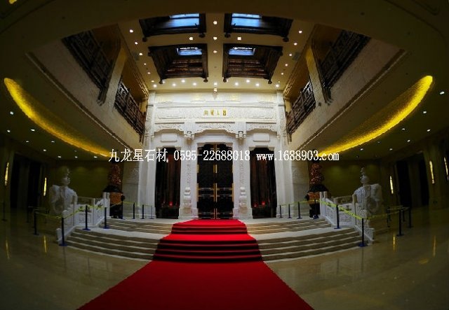 門廳是梵宮的交通集散樞紐。門廳面寬約110米,進(jìn)深18米;東側(cè)通道通往餐飲區(qū)域,西側(cè)通道通往會議區(qū)域。正面三扇仿石窟造型的金色大門是梵宮主入口,通往廊廳。整個門廳主色調(diào)呈佛教傳統(tǒng)的明黃色,給人以平靜祥和之感。漢白玉鋪就的地面清新典雅,莊嚴(yán)而古樸,透明的四格天窗與下方的圓壇遙相呼應(yīng),柔和而自然。陳列于門廳兩側(cè)高達(dá)3.8米的東陽木雕精品“和諧雙瓶”,為東陽木雕傳人陸光正大師的問鼎之作,寓意和諧美好。