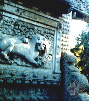 乾隆十三年(1748年)進(jìn)行了大規(guī)模的修建,并仿五塔寺而建石雕金剛寶座塔。同時(shí)新建木、石、磚三聯(lián)牌樓。其中石牌樓最為精致,雕刻極細(xì),是典型的清代風(fēng)格。北京的磚牌樓只有碧云寺這一例.碧云寺磚牌樓,從其形制看,其仍屬于琉璃牌樓一類.碧云寺石坊為四柱三間沖天柱式,兩側(cè)共有四座石雕影壁屏風(fēng),它該算是北京影壁最多的牌樓.
