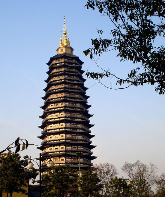 天寧寶塔乃中華第一佛塔(全球最高佛塔)位于江蘇省常州市天寧寺內(nèi)。天寧寶塔始建于2002年4月,于2007年4月30日開光。總建面積2.7萬平方米,塔高13層153.79米,為國內(nèi)4000多座寶塔之最;從底層地宮到頂層鐘樓,整座寶塔以佛教文化為主線,以東陽木雕、揚州漆器、常州亂針繡、惠安石雕等手工藝術(shù)為表現(xiàn)手法,巧妙地詮釋了大乘佛教的諸多教義。佛塔的建成,與北方云崗大佛、中原龍門大佛、西方樂山大佛、東方靈山大佛、南方香港天壇大佛遙相呼應(yīng),成為五方五佛的佛心。