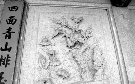 步入正門,只見(jiàn)大門兩旁立有兩個(gè)黑色的扁體石鼓、部分石雕等,其工藝相當(dāng)精細(xì)。正面兩邊墻壁上鑲嵌有完整的“麻雀戲梅”通花石雕,供游人觀賞、品味;抬頭望去,屋頂為穿斗式、架梁蓋瓦的硬山頂結(jié)構(gòu)。