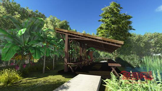 入世境為寺域前區(qū),作停車(chē)、暫時(shí)休整之用;山門(mén)為情境轉(zhuǎn)換媒介,拾階而上,山林夾道,洗滌心靈,是為出離境;寺院前部為平坦區(qū)域,以水田農(nóng)禪景觀為主,視野開(kāi)闊,設(shè)置放生池,種蓮養(yǎng)魚(yú),利用參天古樹(shù)和竹林營(yíng)造自然茶室,茶亭茶室與植物互為取景,交相輝映,分布錯(cuò)落有致,形成趣味的園林廊道系統(tǒng),一派世外桃源景象,是為出世境;寺廟殿宇區(qū)域?yàn)榘莘饍x式及僧人居住生活場(chǎng)所,以唐風(fēng)建筑及庭院為主,是為般若境;經(jīng)過(guò)禪堂,石階引向后山的祖師塔區(qū)域,在祖師塔上加茅草穹頂,暗示祖師結(jié)茅而居,是為涅槃境;寺廟后方沿山而建的禪修中心和善客堂,為禪修者提供的專(zhuān)修場(chǎng)所,用高大喬木和竹林與寺廟區(qū)分隔,獲得寂靜氛圍,是為入定境;后山密林深處,罕有人至,閉關(guān)獨(dú)居,悠然逍遙,是為云仙境。