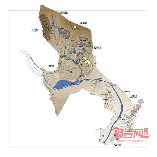 洞山,禪宗曹洞宗祖庭。設(shè)計(jì)理念在于借山林景觀表現(xiàn)農(nóng)禪景觀,在各個(gè)景觀節(jié)點(diǎn),用木構(gòu)建筑論釋禪境。建筑應(yīng)山水之體勢(shì),空間立所,起于山水又回復(fù)山水。逢渠、石、水面等則建橋廊等駐足憩息之地,讓位于場(chǎng)地態(tài)勢(shì)和氣象,得自然之昭示與引領(lǐng),以會(huì)祖師之意。整體敘事結(jié)構(gòu)為禪修次第意向組成的系列空間,景移心異,逐次第開(kāi)。建筑群有明確軸線(xiàn)控制,背山面池,景觀空間布局按照禪修境界分為七個(gè)區(qū)域:入世境、出離境、出世境、般若境、入定境、涅槃境、云仙境,形成整體推進(jìn)的修行秩序氛圍之場(chǎng)所。