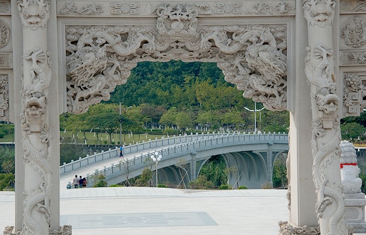 整座山門造型獨(dú)特,兩側(cè)護(hù)衛(wèi)山門的八根特殊龍柱,又稱“福賜八大龍金剛”,與山門形成穩(wěn)固的三角形,這在全國的石質(zhì)山門中絕無僅有。支撐山門的其他柱子則采用了多重疊加方式,先垂直后倒掛,遍布整座山門有100多條龍,象征著富貴和吉祥。據(jù)報(bào)載山門的修建請(qǐng)來了近60名一流的福建惠安石雕師傅,前后耗時(shí)3年,耗資1000萬元左右。