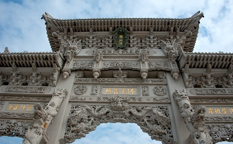 百余名惠安石雕師傅歷時(shí)兩年雕刻完工。梅山寺石質(zhì)山門總高度23米,寬23.6米,全部由花崗巖石雕刻而成,四柱三門結(jié)構(gòu),大型山門總石方用量達(dá)680多立方米,居我國現(xiàn)有石質(zhì)山門中石方用量之首。山門雕刻工藝高超,其復(fù)雜程度和難度全國罕見。斗拱采用的是整塊石材,