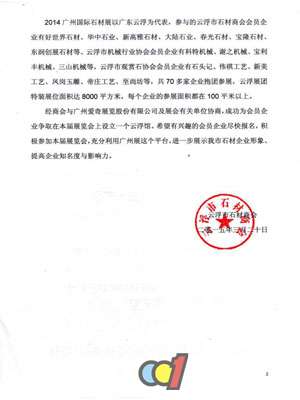 2015年3月20日,云浮市石材商會也發(fā)出了云石商字(2015)第02號文,希望云浮的石材企業(yè)也積極報名參展,云浮石材企業(yè)在云浮石材商會、云浮機(jī)械協(xié)會、云浮觀賞石協(xié)會的帶領(lǐng)下,2014年的參展面積達(dá)到了8000平方米,2015年的參展面積預(yù)計將會突破10000平方米,云浮市石材商會與廣州石材展簽署三年的戰(zhàn)略合作協(xié)議,每年的參展規(guī)模將會上漲20%以上。