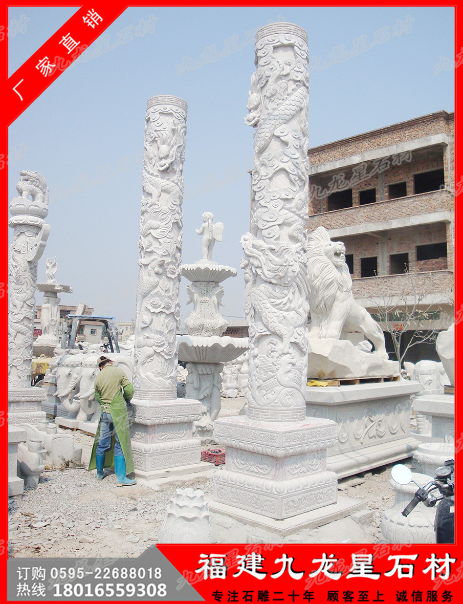 二、石雕龍柱現(xiàn)貨制作廠家常用石材介紹石雕龍柱由多種工藝制作,圓雕石雕龍柱,透雕石雕龍柱,線雕石雕龍柱,平雕石雕龍柱,浮雕石雕龍柱,畫雕石雕龍柱,影雕石雕龍柱等工藝。石雕龍柱外形有圓柱石雕龍柱和棱形石雕龍柱。石雕龍柱可用多種石料雕刻而成,常用:花崗巖石雕龍柱(青石石雕龍柱,白麻石雕領證,銹石石雕龍柱等),大理石石雕龍柱(漢白玉石雕龍柱、晚霞紅石雕龍柱),也可用玉質(zhì)石料雕刻,天青墨玉石雕龍柱、霞玉石雕龍柱、緬甸玉石雕龍柱等。