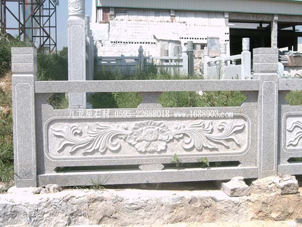 石欄桿低欄高0.2~0.3米,中欄0.8~0.9米,高欄1.1~1.3米。欄桿柱的間矩一般為0.5~2米。欄板浮雕題材為“雙鳳爭(zhēng)輝”。