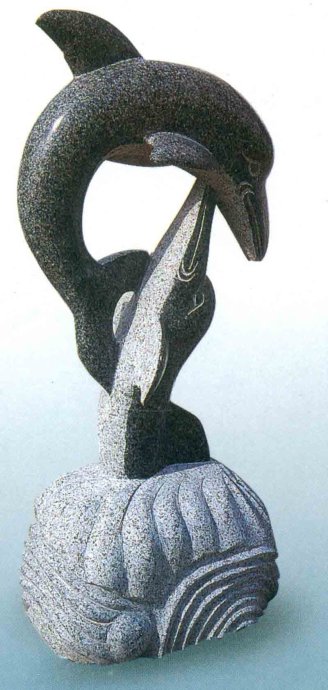 此尊石雕海豚作品創(chuàng)意來自于“海豚戲水”。高約1.6米。